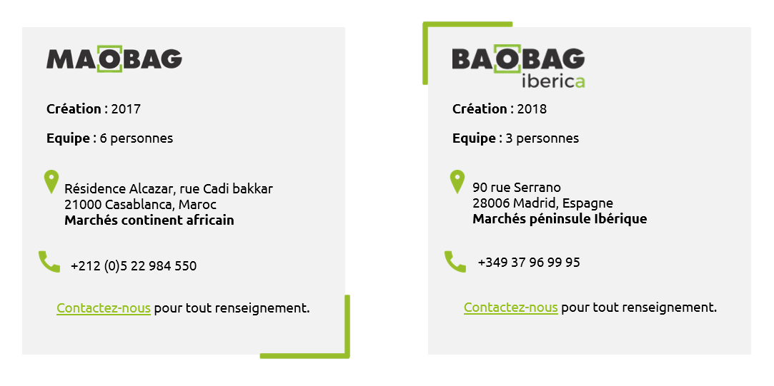 - 2 filiales : Baobag Iberica (Espagne et Portugal) et Maobag (Maroc et continent africain)